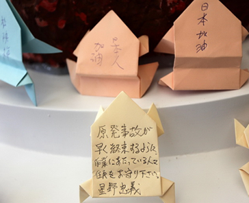 参会者はその場で配られた蛙の折り紙や短冊に復興を祈る言葉を書いた。主催した新故郷文教基金会の廖嘉展理事長は、日本語の「カエル」と「帰る」は同じ発音なので、皆さんの祈りで被災者ができるだけ早く帰れることを願っている、と述べた。力強い太鼓の演奏に合わせ、皆の祈りの声が太鼓の響きに乗せて日本の青空に伝われとばかり、台湾から愛と祝福を贈った。