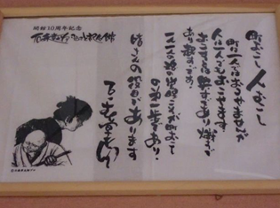 | ヴィーナスの湯に飾ってあった石ノ森章太郎ふるさと記念館のメッセージ。「町おこし人おこし・おこすは興すであり熾すであり起こすです…」 |
